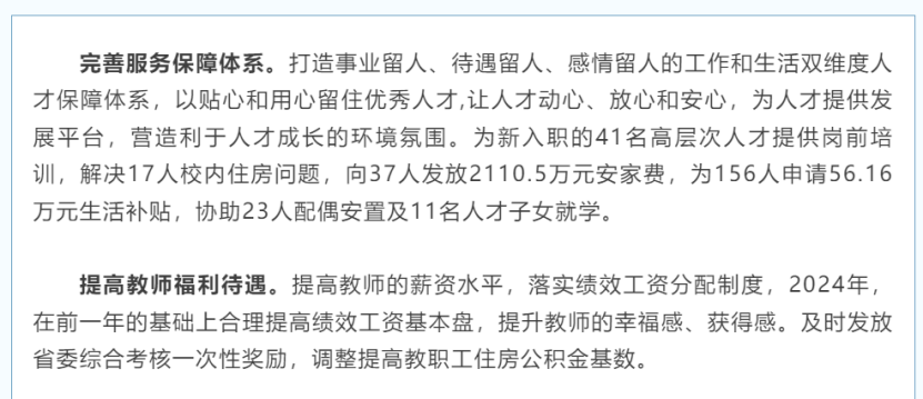 據淮南師范學院近日消息,該校明確表示提高教師的薪資水平,落實績效工資分配制度,2024年,在前一年的基礎上合理提高績效工資基本盤,提升教師的幸福感、獲得感。及時發放省委綜合考核一次性獎勵,調整提高教職工住房公積金基數。