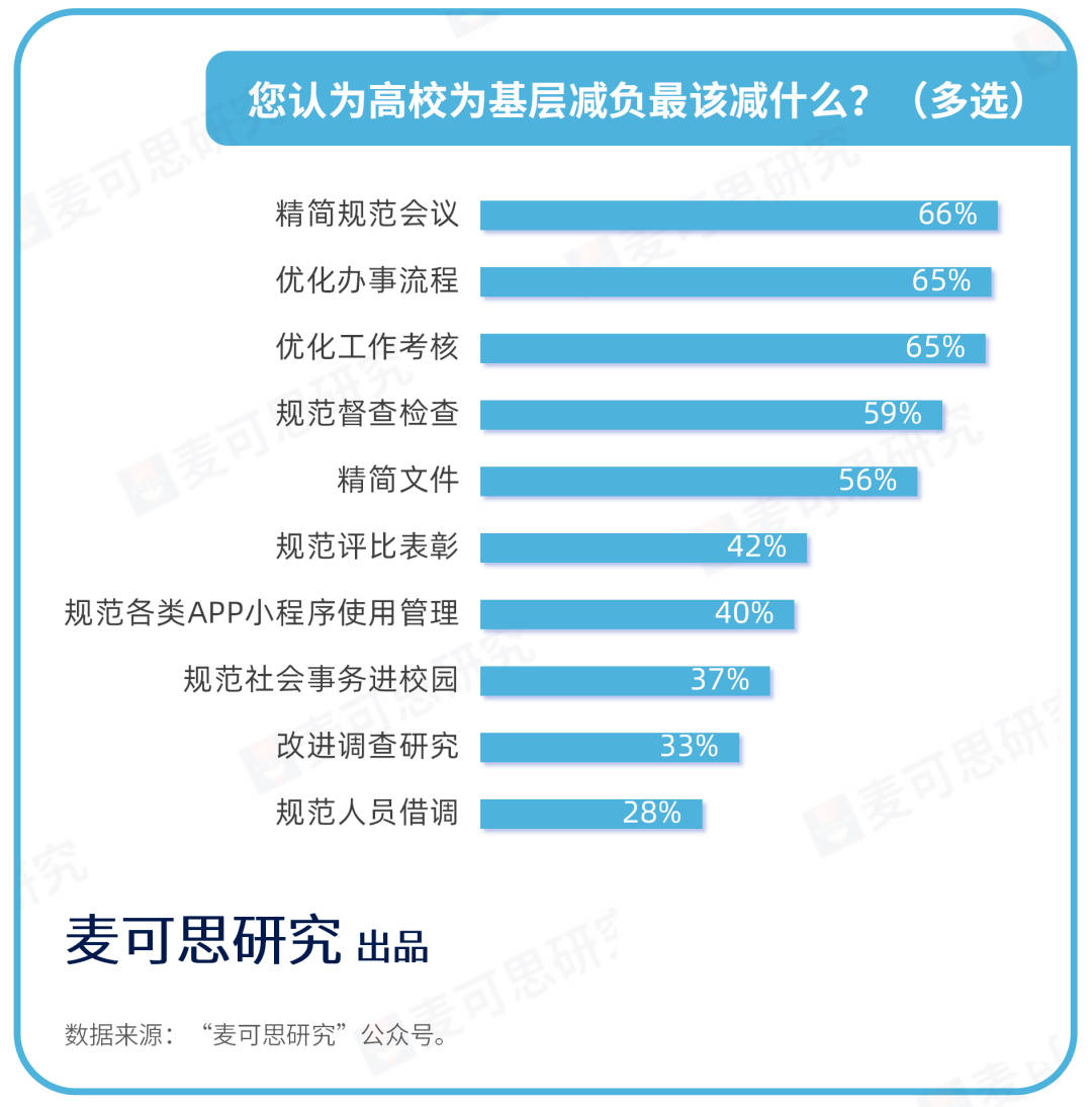 高校要為基層減負,教師們最希望減什么?此前,麥可思研究曾發起相關投票。最終,精簡規范會議、優化辦事流程、優化工作考核、規范督查檢查、精簡文件等5個方面依次獲得票數最多,得票率均超過50%。