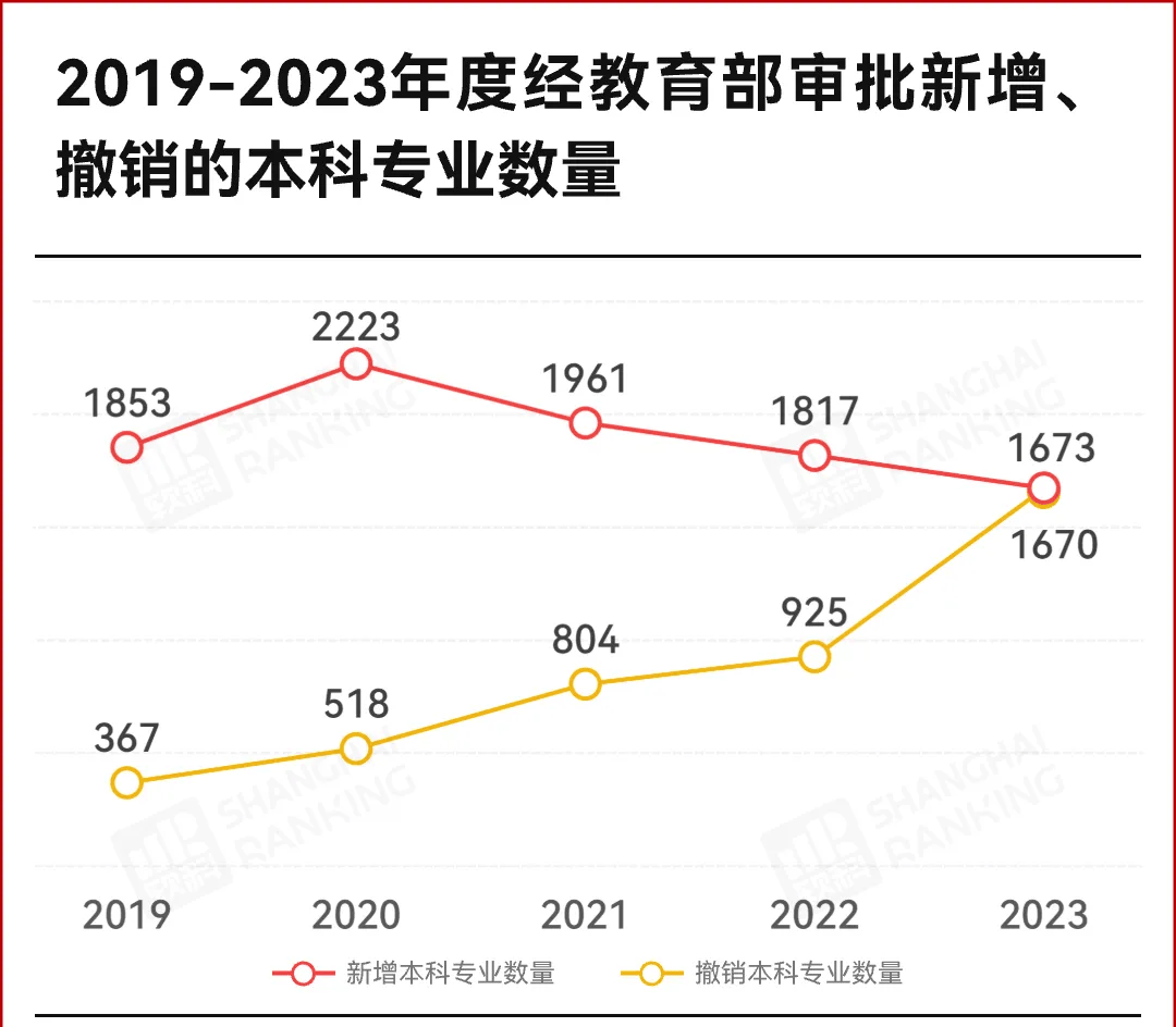 據教育部數據,12年來,新增本科專業布點數2.1萬個,撤銷或停招不適合經濟社會發展的專業布點數1.2萬個。尤其是在2024年3月,2023年度普通高校本科專業備案和審批結果顯示,本科專業增設、撤銷、調整共涉及專業布點3389個,再往前算三四年,每年高校調整的專業布點數雖在逐年增多,但都沒有突破3000大關,此次是歷史上規模最大的專業調整。
