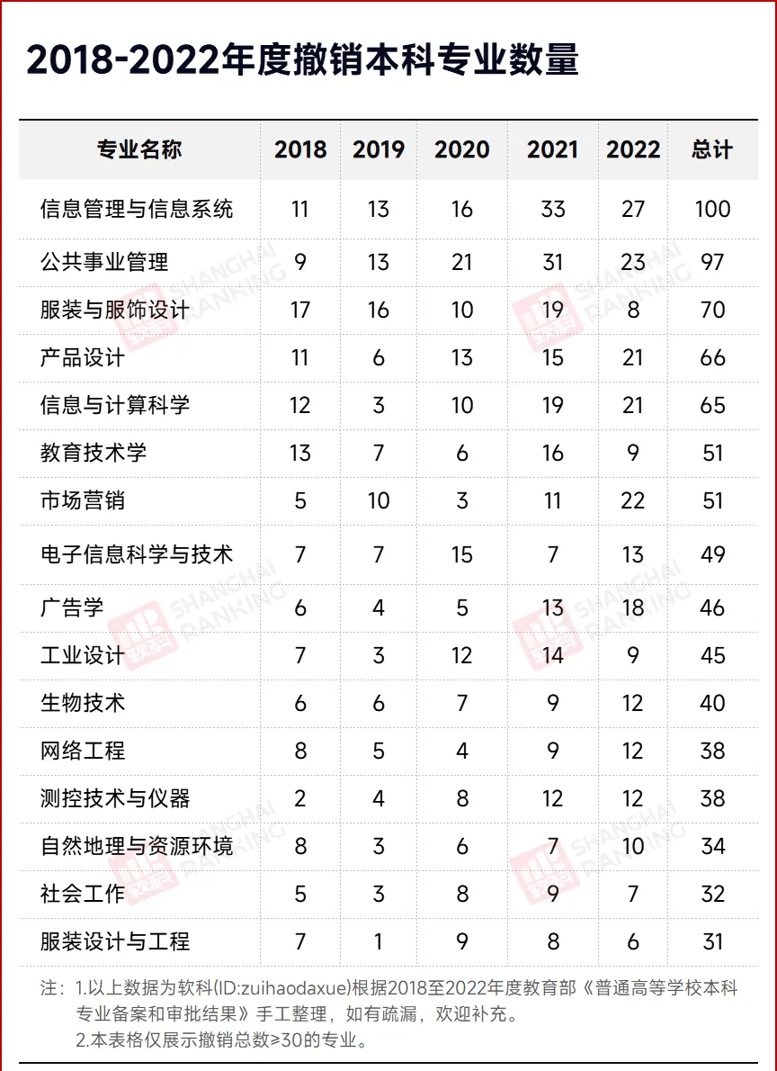 從全國范圍看,梳理近5年的數據,幾乎所有學科類別的專業,撤銷數量都整體呈上升趨勢。管理學門類下的信息管理與信息系統專業高居榜首,共有100所高校撤銷。有97所高校撤銷公共事業管理專業,位列第二。