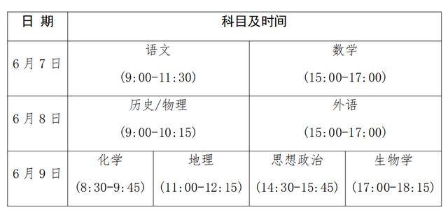 根據《規定》,全國統考和選擇性考試將于6月7、8、9日舉行,共考試3天。其中,6月7日,進行語文和數學考試,6月8日進行歷史/物理和外語考試,6月9日則進行化學、物理、思想政治、生物學考試。