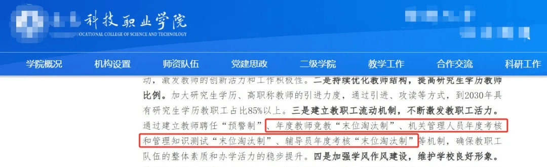 成都某職業(yè)學院《高等職業(yè)教育質量年度報告(2022)》中明確指出,學校率先在輔導員隊伍中試行末位淘汰。山西某公辦高校在《普通高等學校本科教育教學審核評估自評報告》中提到,學校將教學考察結果納入考核條件、按照10%的比例末位淘汰,激勵教師將主要精力投入到教學工作中。蘭州某高校對中層干部實行考核末位淘汰制。綜合考核成績在末位者,當年給予警告;如第二年又在末位者,給予降職或免職處理;連續(xù)三年在末二位者給予免職處理。
