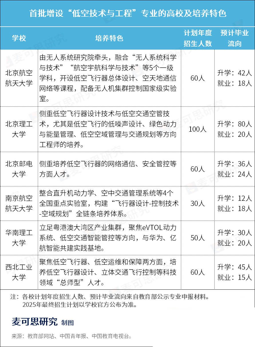 為更快響應(yīng)國(guó)家戰(zhàn)略,教育部首次建立了戰(zhàn)略急需專業(yè)超常設(shè)置機(jī)制,突破集中申報(bào)限制,指導(dǎo)北京航空航天大學(xué)等6所高校增設(shè)“低空技術(shù)與工程”新專業(yè)。并且從各校的專業(yè)人才培養(yǎng)方向來(lái)看,不同院校各具特色。
