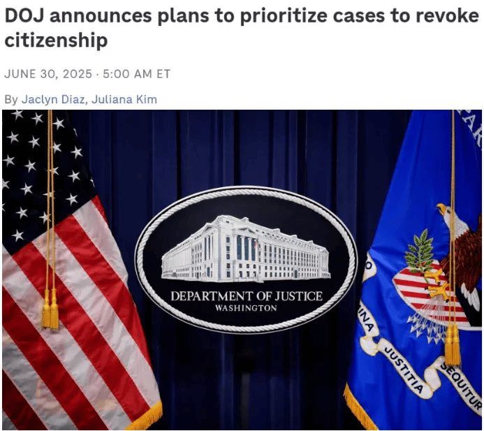美國司法部6月11日發(fā)布重磅備忘錄,正式將撤銷歸化公民國籍政策制度化,引發(fā)社會各界廣泛關(guān)注。