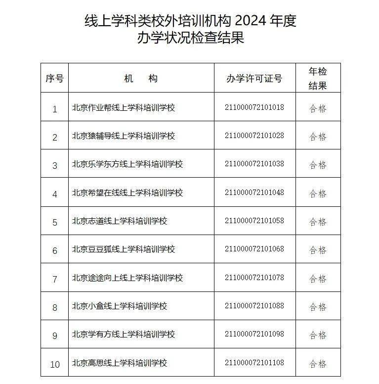 新京報訊(記者楊菲菲)7月1日,北京市教委發布通知稱,近期,市教委會同相關部門對2024年度線上學科類校外培訓機構的辦學狀況進行了檢查,經綜合考慮相關部門和專家組評審意見,并結合日常監管情況,10所線上學科類校外培訓機構年檢結果評定為“合格”等次。