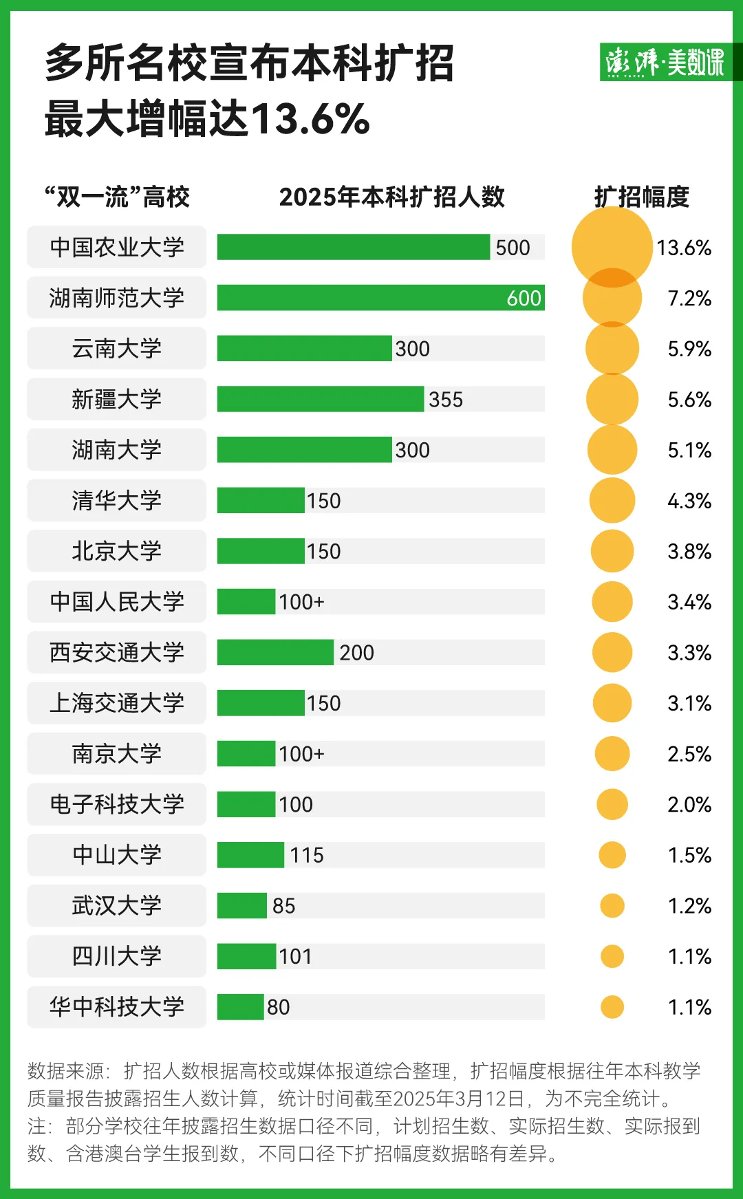 而擴招幅度最大的,是中國農業大學。3 月 6 日,中國農業大學宣布,2025 年將緊緊圍繞糧食安全、生物智造、人工智能與裝備制造等學科領域,增加 500 名本科生名額,擴招幅度達到了 13.6%。