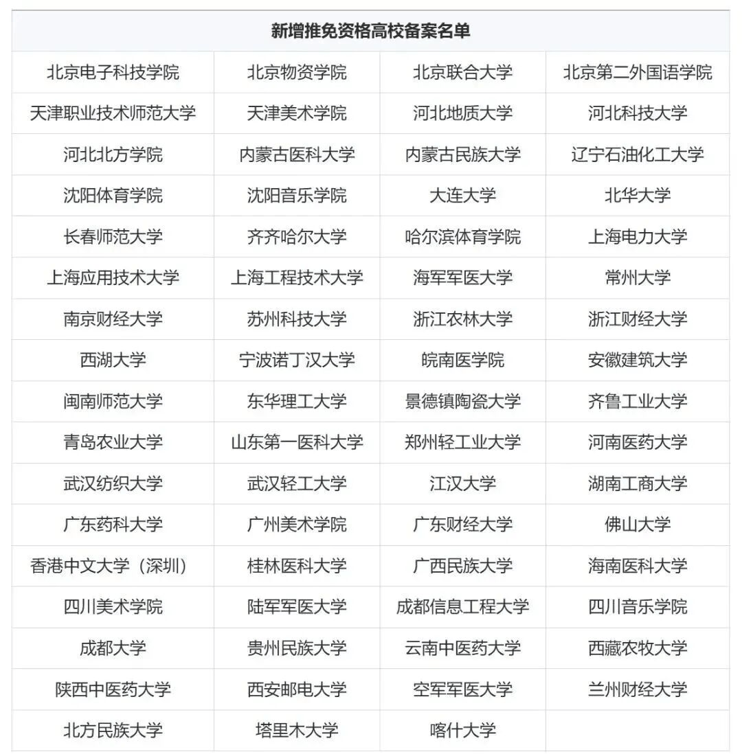 根據做好新增推免資格高校申報及確認工作有關部署,經符合條件高校自主申報、高校所在地省級教育行政部門確認推薦并公示,現對北京電子科技學院等67所新增推免資格高校予以備案。