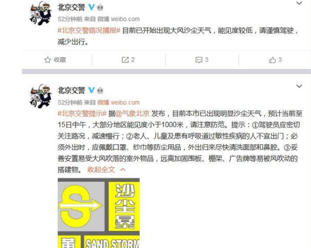 前北京市已出現明顯沙塵天氣。北京市公安局公安交通管理局官方微博引述北京市氣象局官方微博消息稱,預計當前至15日中午,北京大部分地區能見度小于1000米,請注意防范。北京市教育委員會官方微博而后指出,請各區教委、直屬學校、中等職業學校及校外教育機構暫停戶外活動并做好健康防護。