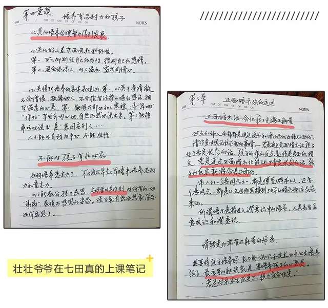 值得一提的是,爺爺有時(shí)也會(huì)陪同壯壯一起上課。在七田真,爺爺了解到了培養(yǎng)孩子心靈的重要性,學(xué)會(huì)了通過(guò)正面暗示讓孩子處于積極正能量的狀態(tài)。因?yàn)樯钪?ldquo;早教,不只是孩子一個(gè)人的事情”,所以每次上課的時(shí)候,都會(huì)認(rèn)真記筆記、劃重點(diǎn)。