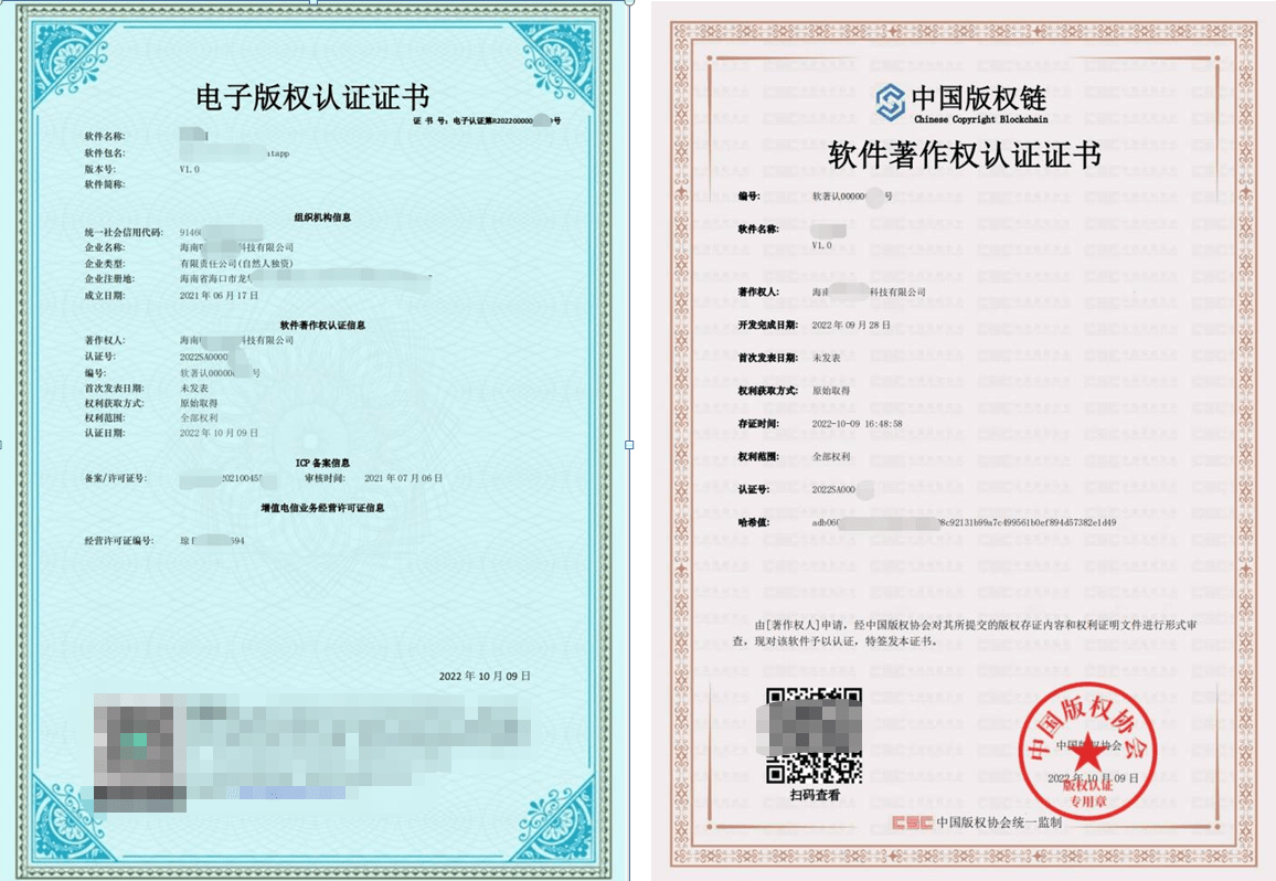 軟著認證電子版權是指兼容軟著認證證書的電子版權認證證書,與兼容軟著登記證書的電子版權認證證書或者紙質版軟著登記證書一樣,在移動互聯網App上架審核中具備同等效力,均可作為軟件的版權證明材料。軟著認證電子版權有兩頁,具體樣式如下圖所示: