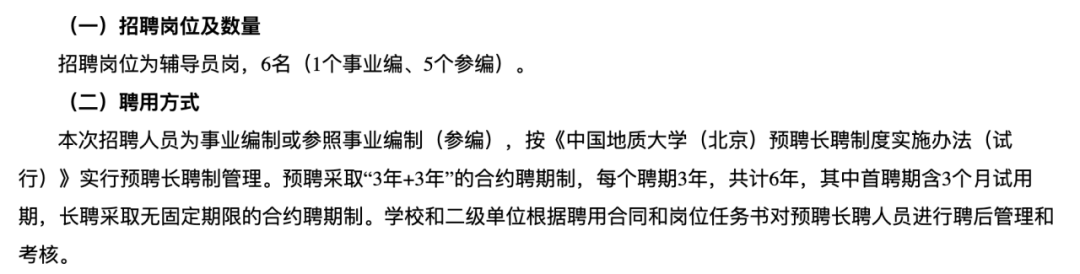 中國地質大學(北京)于今年3月17日發布的輔導員招聘公告,欲聘任6名輔導員,均按《中國地質大學(北京)預聘長聘制度實施辦法(試行)》實行預聘長聘制管理。