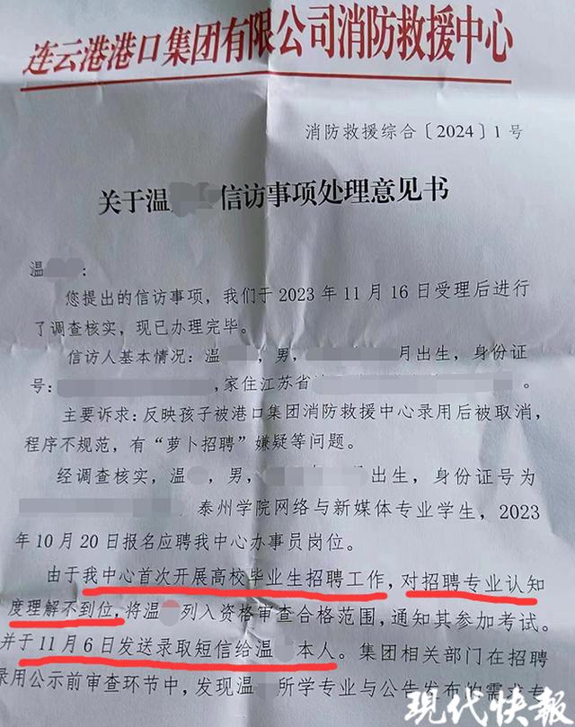 記者了解到,此前,在今年1月12日,連云港港口集團(tuán)有限公司消防救援中心向溫先生出具了書面回復(fù),其中明確提到,針對(duì)溫先生提出“蘿卜招聘”的質(zhì)疑,中心安排專人登門解釋。為杜絕發(fā)生違規(guī)行為,集團(tuán)相關(guān)部門決定取消2024年度消防救援中心辦事員崗位招聘計(jì)劃,3年內(nèi)不得開展招錄工作。
