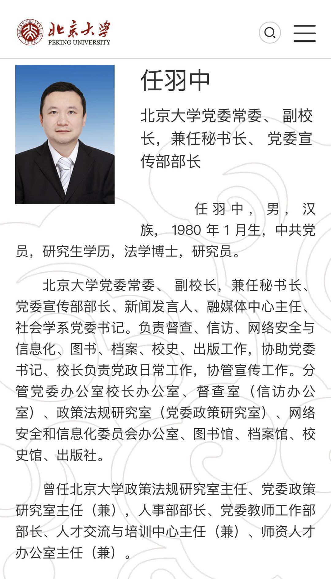 封面新聞記者注意到,3月26日,北京大學網站“現任領導”一欄,已列入任羽中相關信息。