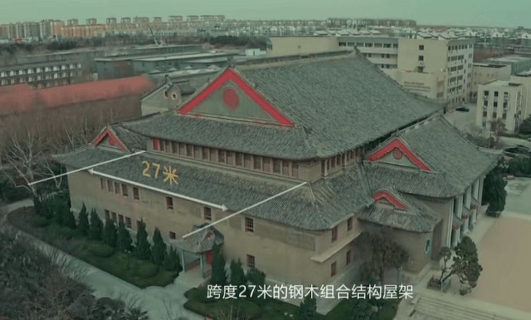 大禮堂運用了當時最先進的技術,尤其是選用了27米英國進口鋼屋架,創造了當時全國最大的大跨度空間。