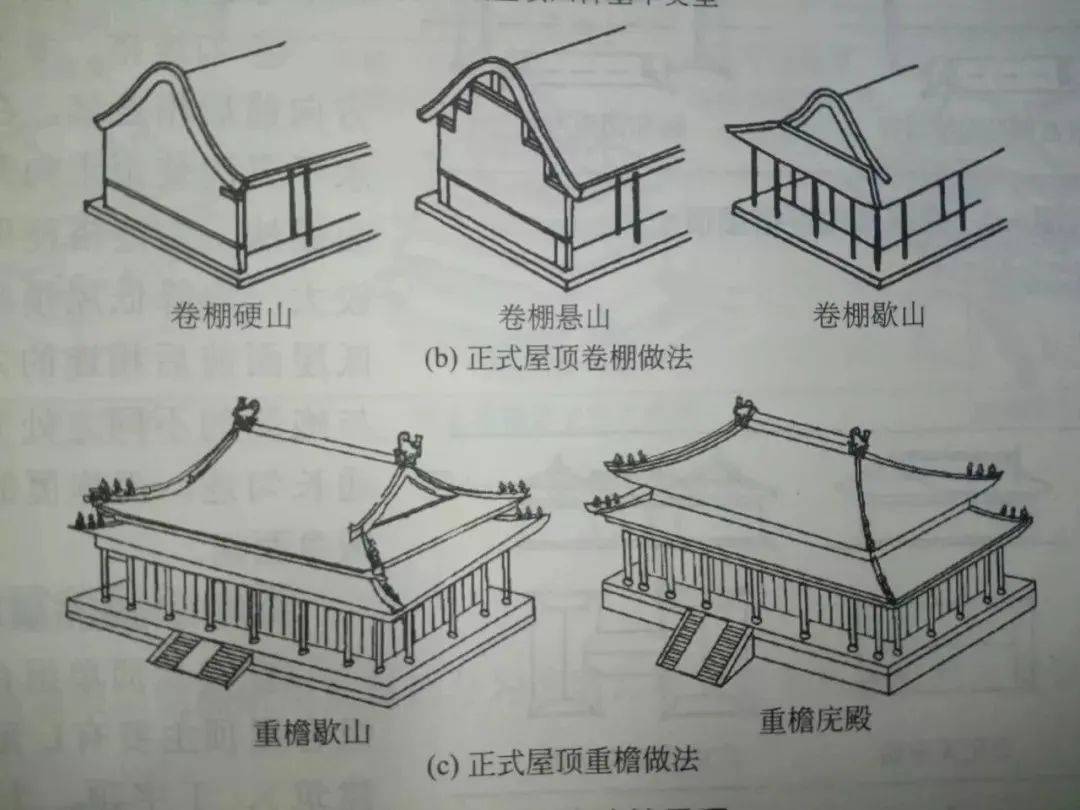 重檐歇山——大禮堂采用了中式建筑中宏偉的重檐歇山頂,這可是僅次于重檐廡殿的屋頂形制。中國古代建筑的屋頂式樣非常豐富。等級低者有硬山頂、懸山頂,等級高者有廡殿頂、歇山頂。廡殿頂、歇山頂、攢尖頂等又有單檐,重檐之別,攢尖頂則有圓形、方形、六角形、八角形等變化形式。(如下圖)