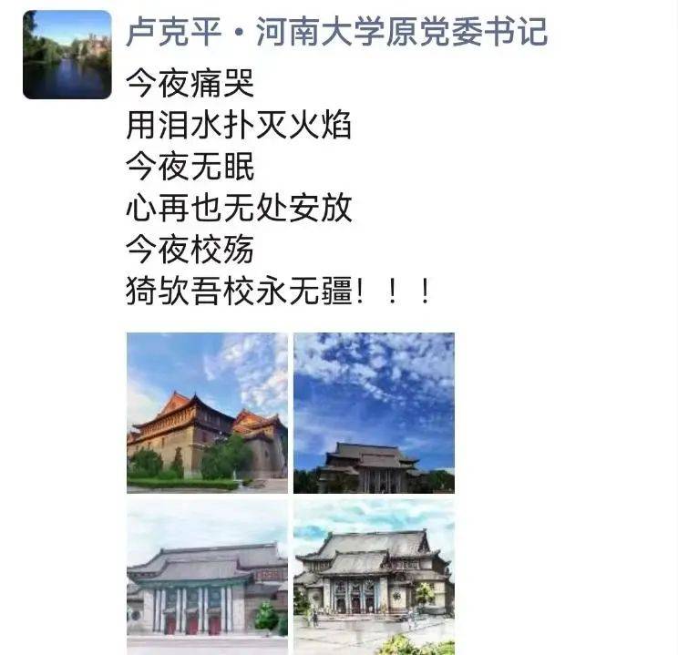 火災之后的凌晨2時36分,河南大學原黨委書記盧克平發帖:今夜痛哭,用淚水撲滅火焰。今夜無眠,心再也無處安放。今夜校殤,猗歟吾校永無疆!!!