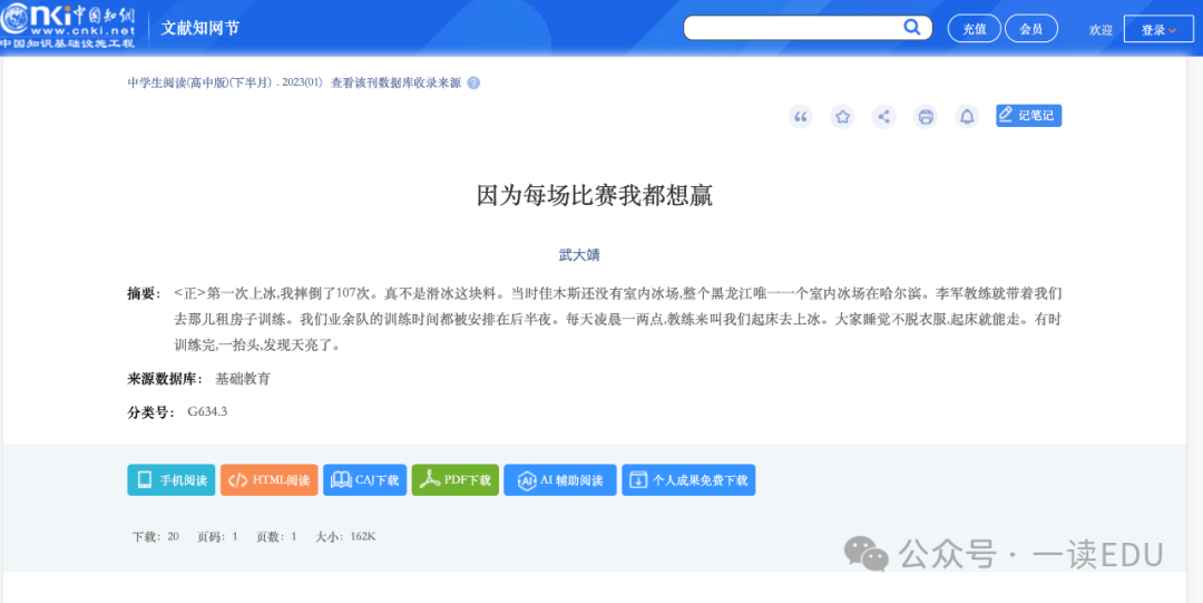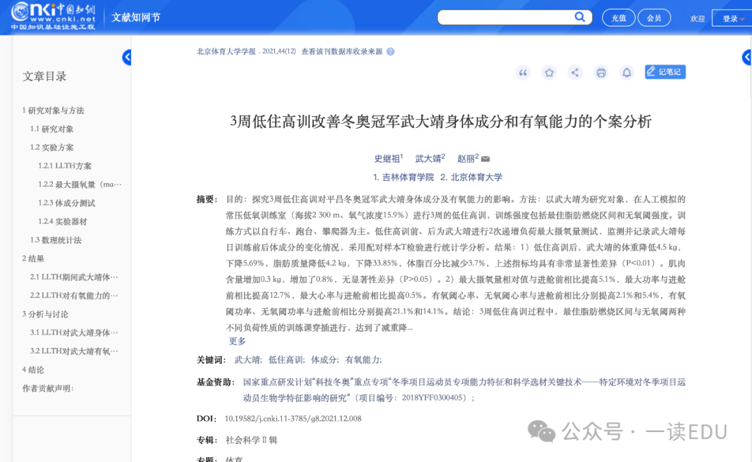 由此可見,領軍教授A崗需要應聘人員有足夠的科研能力與學術能力。但一讀君在知網以“武大靖”為作者進行檢索后得到兩篇文章。一篇是2023年發表在《中學生閱讀(高中版)(下半月)》的《因為每場比賽我都想贏》,另一篇是2021年作為第二作者與他人合作發表在《北京體育大學學報》的《3周低住高訓改善冬奧冠軍武大靖身體成分和有氧能力的個案分析》。