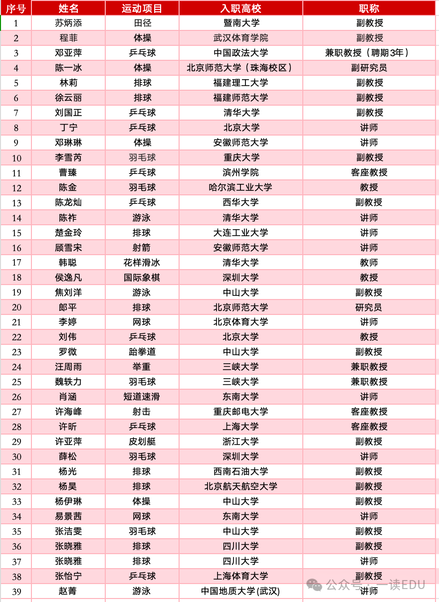 奧運冠軍退役后步入高校執教的現象并不罕見。一讀統計了一些退役冠軍到高校任職的情況,具體如下圖。