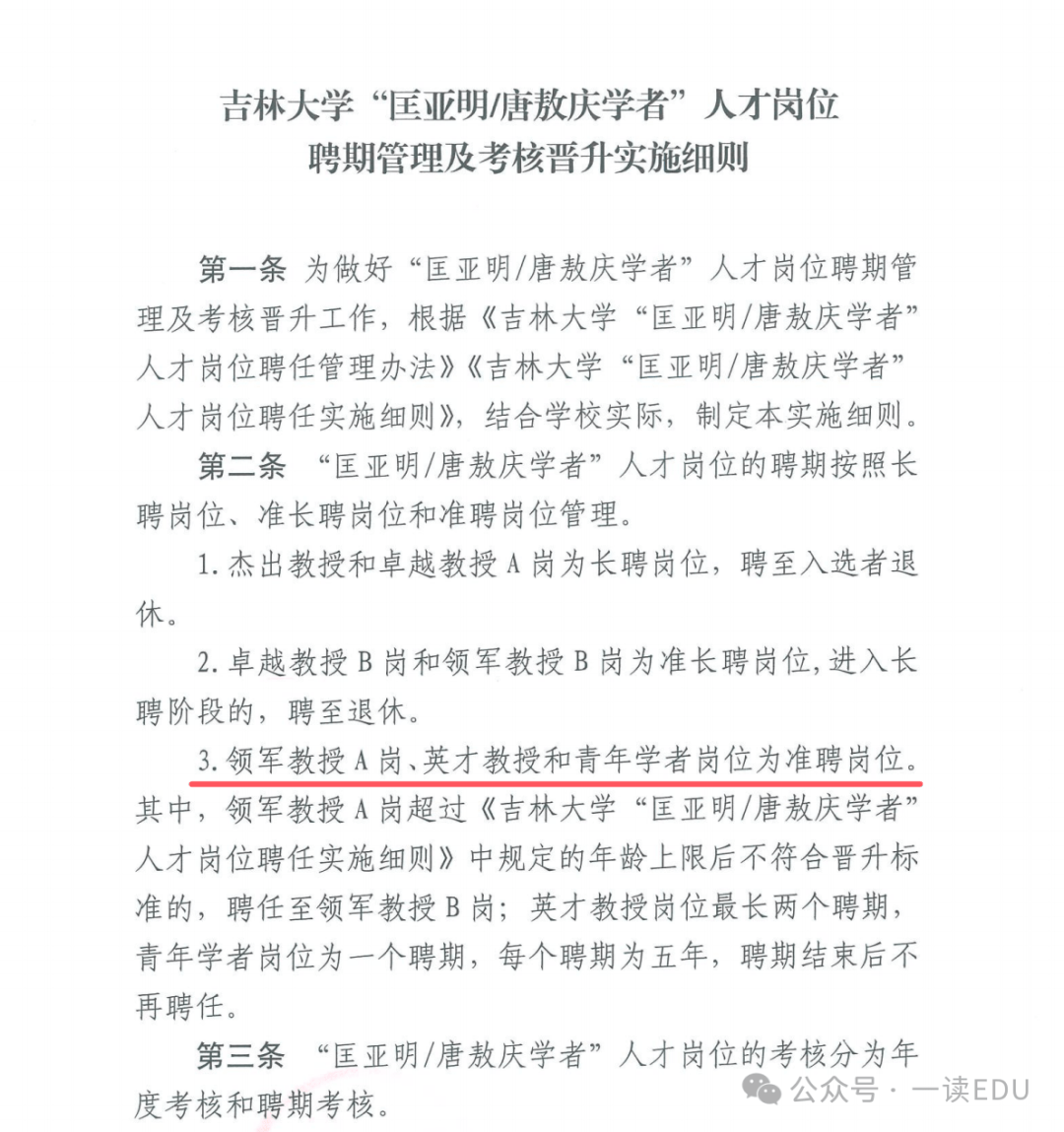 (《吉林大學“匡亞明/唐敖慶學者” 人才崗位聘期管理及考核晉升實施細則》,圖片:吉林大學官網)