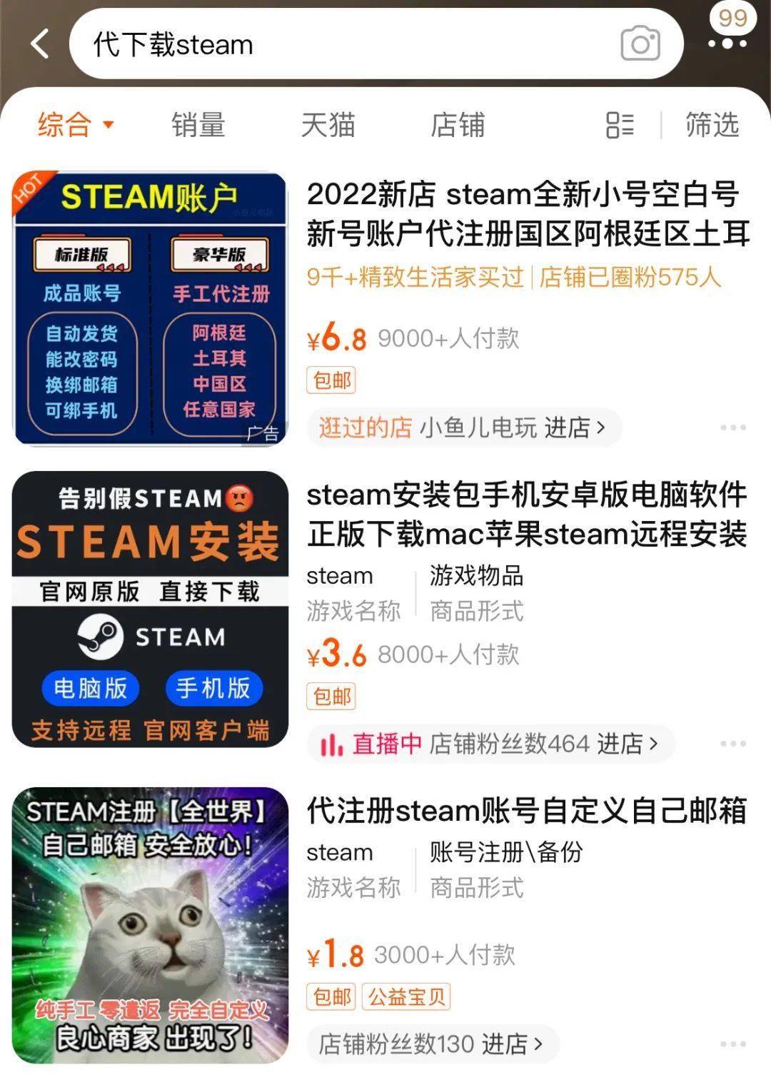 「steam代安裝」在淘寶非常熱門(mén),多家店鋪都擁有大幾千的訂單量,且不少人是因?yàn)榈谝豢顕?guó)產(chǎn)3A大作《黑神話(huà):悟空》即將上線,于是想著下個(gè)steam去見(jiàn)證歷史。