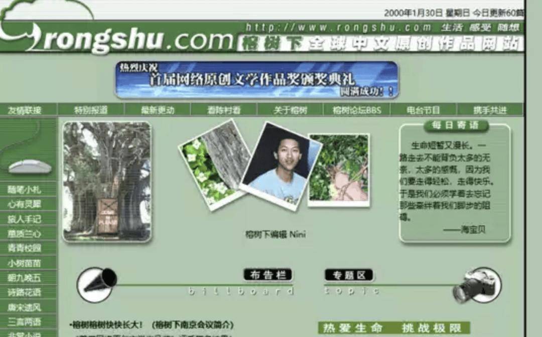 OICQ彼時(shí)尚未誕生,坐在里面的老網(wǎng)蟲(chóng)大都在看一個(gè)叫「榕樹(shù)下」的網(wǎng)站,它是中文互聯(lián)網(wǎng)第一大讀書(shū)社區(qū),創(chuàng)始人朱威廉如此形容它:燈紅酒綠的世界,網(wǎng)上有這樣一棵樹(shù),可以讓你回歸質(zhì)樸。