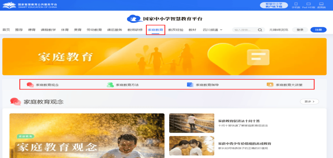這個平臺是由教育部主辦,包括德育、課程教學、體育、美育、勞動教育、課后服務、教師研修、家庭教育、教改經驗和教材10個版塊資源。除了能電腦登錄,平臺還有手機版、Pad HD版、桌面端,主打一個無論用什么方式都能方便娃好好學習。