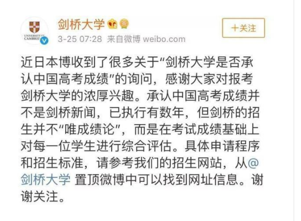 劍橋認可高考成績 消息一出,許多網友都紛紛表達自己的“激動之情”