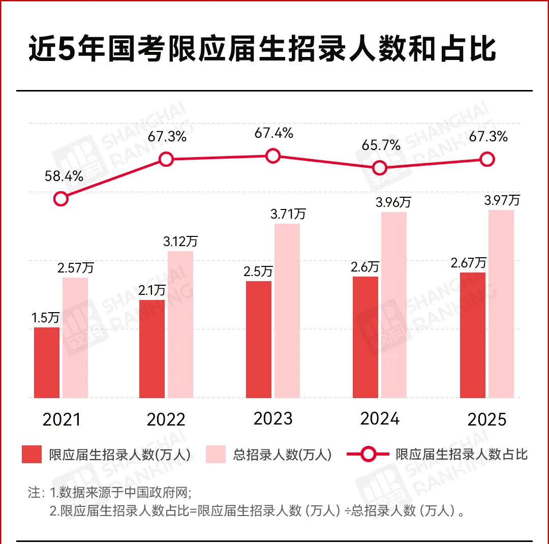 結合近5年國考崗位數據,自2021年起,國考面向應屆生的招錄人數逐年攀升,從2021年的1.5萬人,到2023年的2.5萬人,再到2025年的2.67萬人,僅限應屆生報考的崗位擴招趨勢尤為明顯。自2022年起,國考的應屆生招錄人數占比便已突破60%,并在2025年達到67.3%,這一比例常年穩定在65%-70%,居高不下。