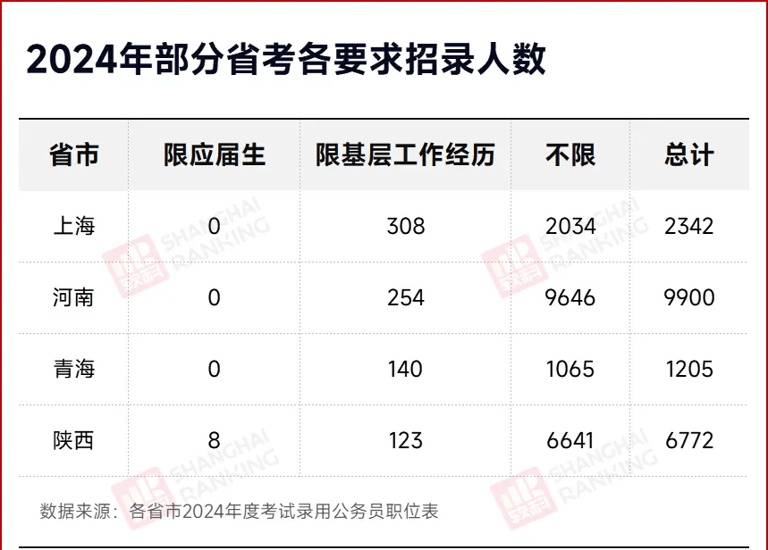 上海市考從不專門設置應屆生崗位,而是傾向于招有基層工作經歷的人,即A類崗位。每年上海2000多人的招錄計劃中,都有200-300人的招錄計劃僅限有工作經驗的往屆生報考,即往屆生可報的崗位為100%,應屆生反而需要和往屆生同臺競爭B類崗位。與上海市考情況相同的是河南省考,去年限應屆生的招錄人數為0,限基層工作經歷的招錄人數為254人。陜西、青海兩地省考限應屆生的崗位也寥寥無幾、甚至沒有。這幾個省市都有一個相同的特征——90%-98%的崗位為身份要求“不限”,對往屆生的包容度極高。