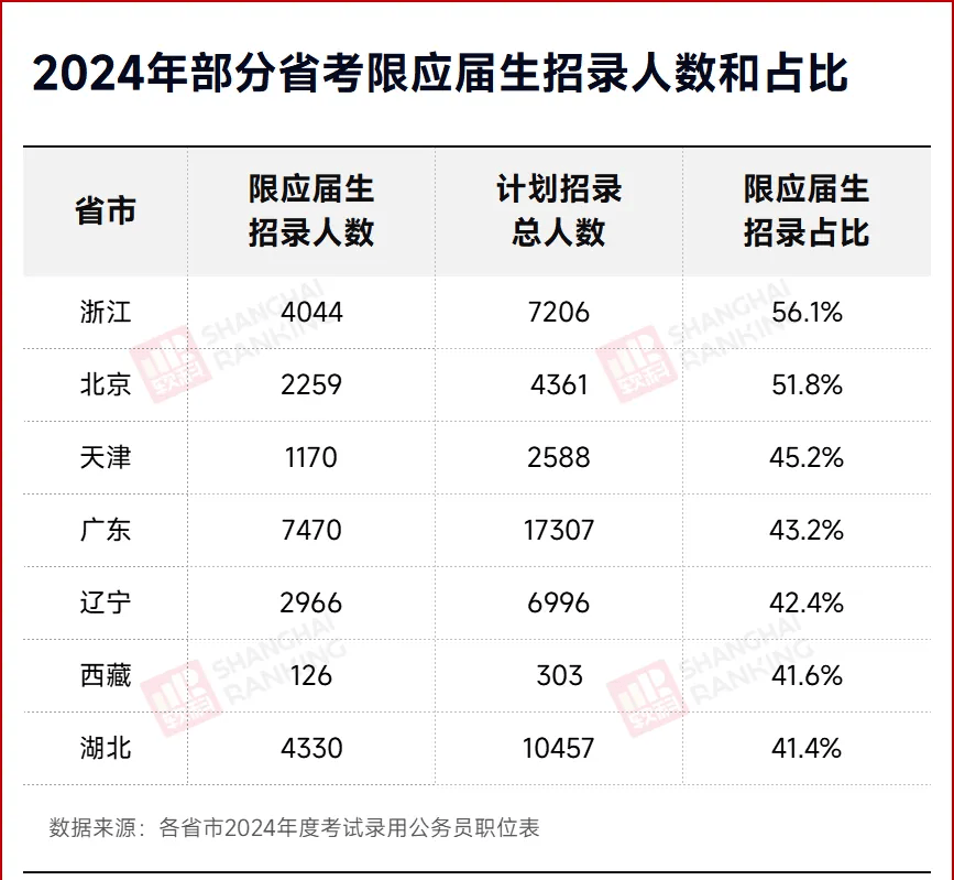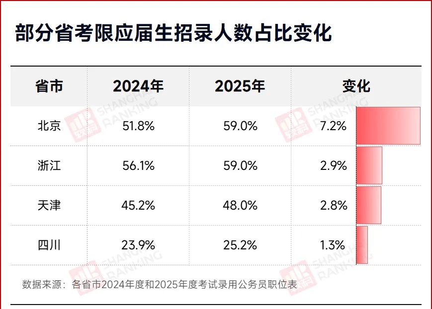 在已發布2025年省考公告的7個省市中,已有4個省市僅面向高校應屆生的名額占比明顯上升。其中浙江、北京對應屆生的“厚愛”尤為明顯,兩省市作為常年應屆生招錄人數占比超過50%的省份,今年的應屆生招錄計劃再創新高,招錄人數均躍升至59%,已逼近六成。