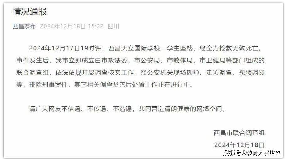 12月18日,西昌市聯合調查組發布通報稱,12月17日晚19時許,西昌天立國際學校一學生墜樓,公安機關現場勘驗、走訪調查,視頻調閱等,排除刑案可能。相關調查和善后處理仍在進行中。(源自九派新聞)