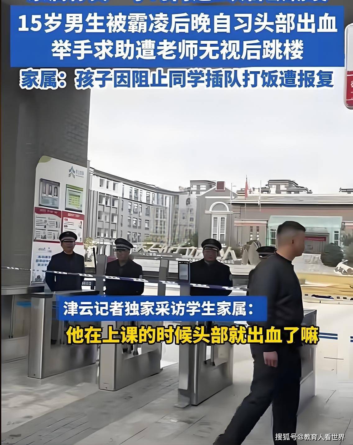 家屬說,事發當天晚餐期間,該生規矩排隊,有同學插隊,該生阻止插隊行為,和同同學發生口角,對方喊了10來名同學毆打他。到走廊的時候,又被毆打一次。上晚課的時候,該生頭部都出血了。該生舉手示意,舉了一分多鐘,老師沒有理他,于是該生就跳樓了。