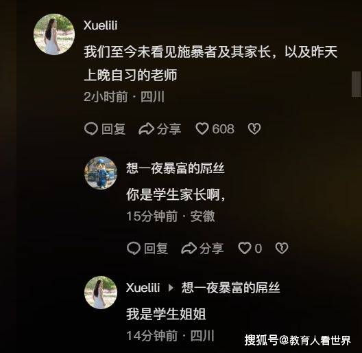 疑似該生的姐姐在評論區透露,至今沒有看到施暴者及其家長,也沒有看到當晚上課的老師。
