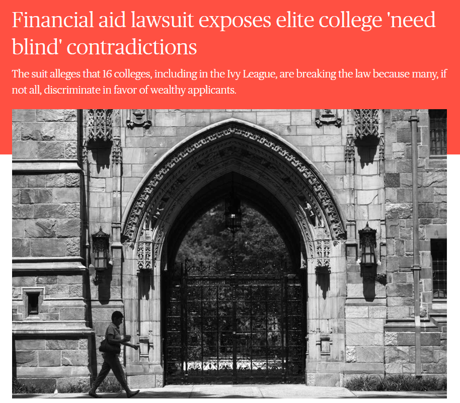 此次事件源于2022年年初,17所美國頂尖大學被8名曾就讀的本科生告上法庭,其訴訟理由是:這些名校偏袒有錢學生,合謀進行價格壟斷,抬高學費,并削減對貧困學生的經濟援助數額,違背了其聲稱的Need-blind政策!