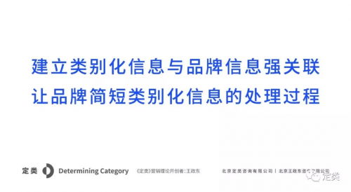 《定類Determining Category》超邊際品牌營銷分析理論,從人類認知原理入手,分析人類對于信息認知的過程,基于類別需求,通過建立類別化信息與品牌信息的強關聯,讓品牌簡短類別化信息處理過程,建立品牌上的直接關聯。