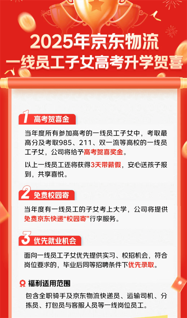 當年度有一線員工的子女考上大學,公司將提供免費京東快遞“校園寄”行李服務。