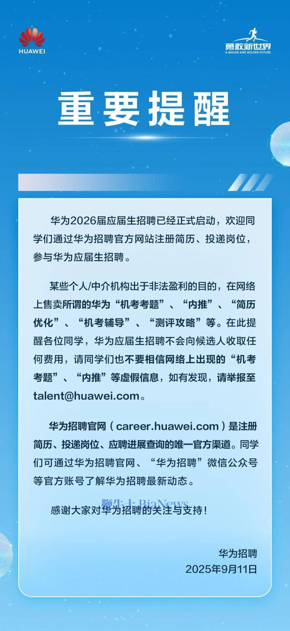 9月11日,“華為招聘”發文辟謠稱,華為招聘不收取任何費用,網絡上售賣所謂的華為“機考考題”、“內推”等為虛假信息。