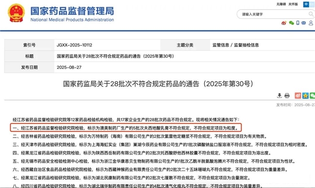 8月27日,國家藥品監督管理局在《關于28批次不符合規定藥品的通告(2025年第30號)》中表明,澳美制藥生產的5批次奧絡夫西地酸乳膏的質量不合格。。