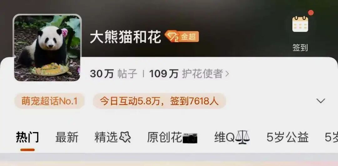 2023年,花花在各大社交平臺爆火,“熊貓和花”先后登上多個(gè)平臺熱搜第一,并長時(shí)間霸榜,被網(wǎng)友稱為“熊貓界的頂流女明星”。
