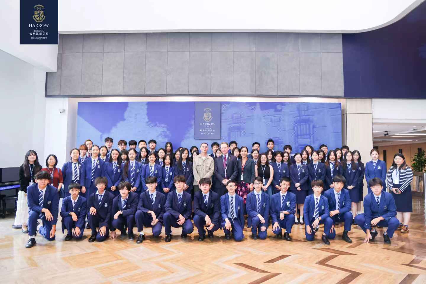 哈羅學(xué)子與牛津大學(xué)國際招生辦主任James Brown先生,哈羅橫琴校長Luke Bartlet以及AISL教育集團教育副總監(jiān)Iris Cheung女士