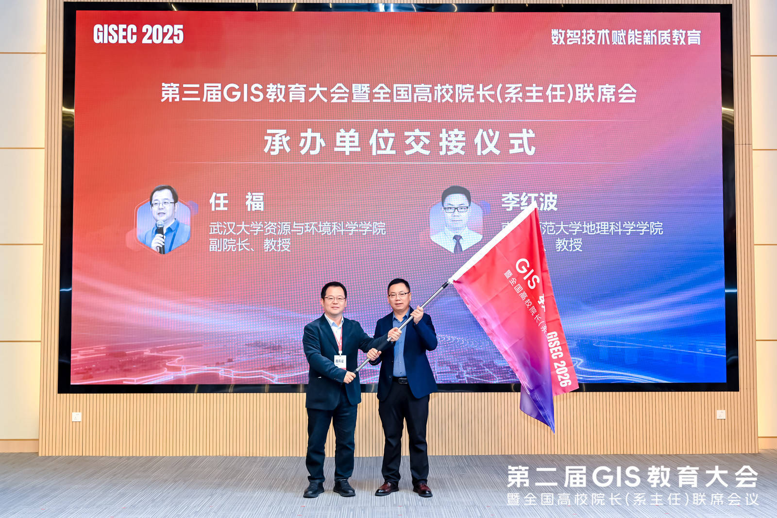 大會舉行了交旗儀式。武漢大學資源與環境科學學院副院長任福教授代表本次大會承辦單位武漢大學資源與環境科學學院,向“第三屆GIS教育大會”承辦單位南京師范大學地理科學學院副院長李紅波教授遞交大會會旗。
