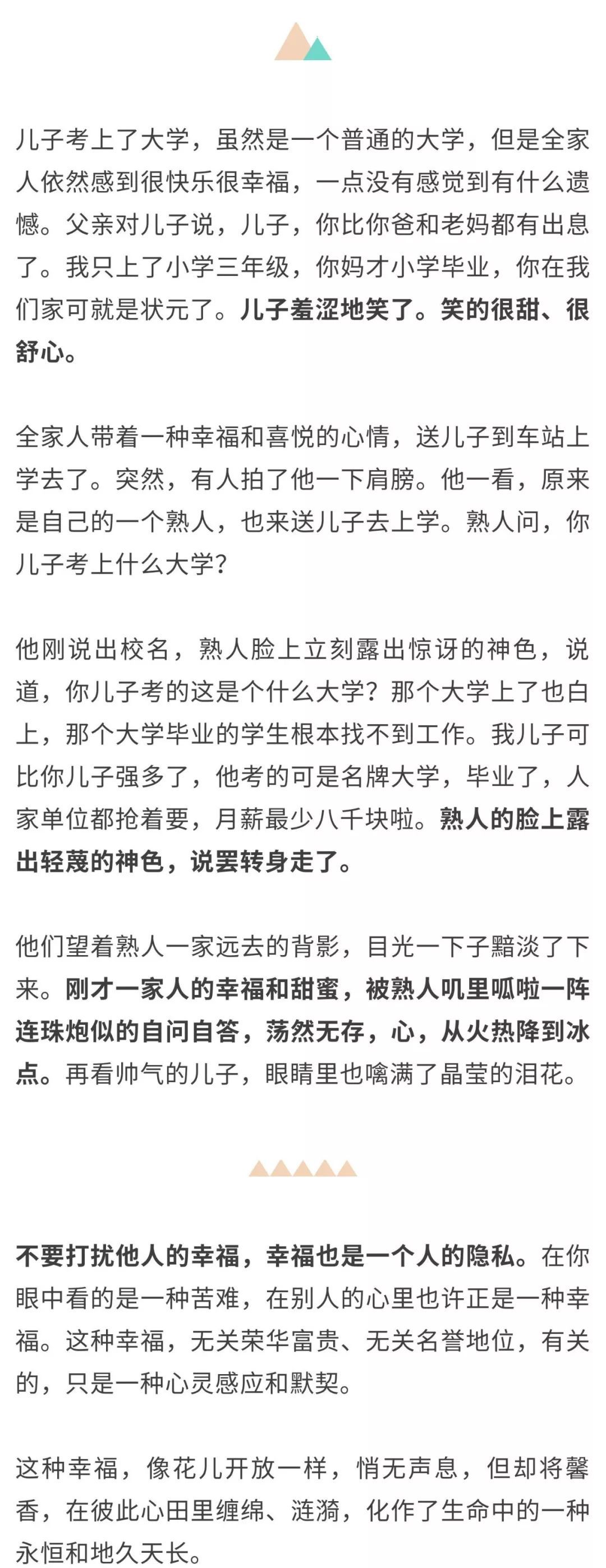 每個人對于幸福的定義是不一樣的,你不能用自己的思想左右著別人,所以無論是家長還是學生,在高考之后,不要對別人的分數以及報考的學校加以評論,更不要去打擾別人的幸福。