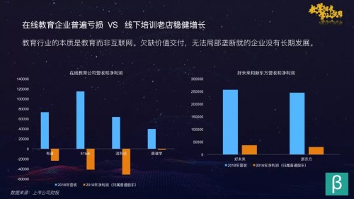 如上圖所示,2018年在線教育企業獨角獸和上市企業普遍虧損嚴重。反而,“將被顛覆”的線下教育老牌機構新東方和好未來卻保持了健康的增長勢頭,絲毫沒有被顛覆的跡象。業內人士分析稱,在線教育的本質是教育而非互聯網,教培企業最終的教育價值交付能力才是長期發展的關鍵。