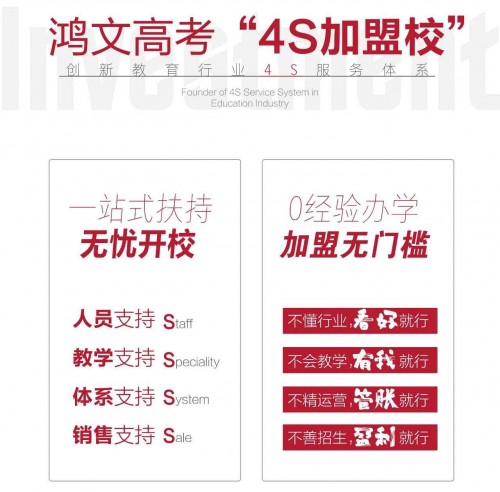 據了解,鴻文高考得以在全國范圍內迅速拓展企業規模的重要原因是其創新的4S加盟服務體系。這一體系對標國際一線品牌肯德基、麥當勞的運營模式,讓教育投資去門檻化,實現無憂辦校經營。