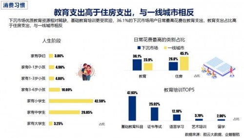 據酷云互動發布的《下沉市場研究報告》顯示,下沉市場的教育意識升級非常可觀,有超過三分之一的人把教育支出作為了日常最高花費。并且和一線城市截然不同的是:下沉市場在教育方面的支出甚至高出了住房支出。