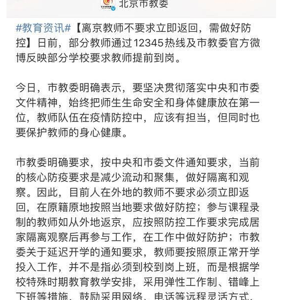 針對(duì)部分離京外出教師通過12345熱線等渠道反映部分學(xué)校要求教師提前到崗的有關(guān)情況,北京市教委在29日明確表示,要堅(jiān)決貫徹落實(shí)中央和市委文件精神,始終把師生生命安全和身體健康放在第一位,教師隊(duì)伍在疫情防控中,應(yīng)該有擔(dān)當(dāng),但同時(shí)也要保護(hù)教師的身心健康。